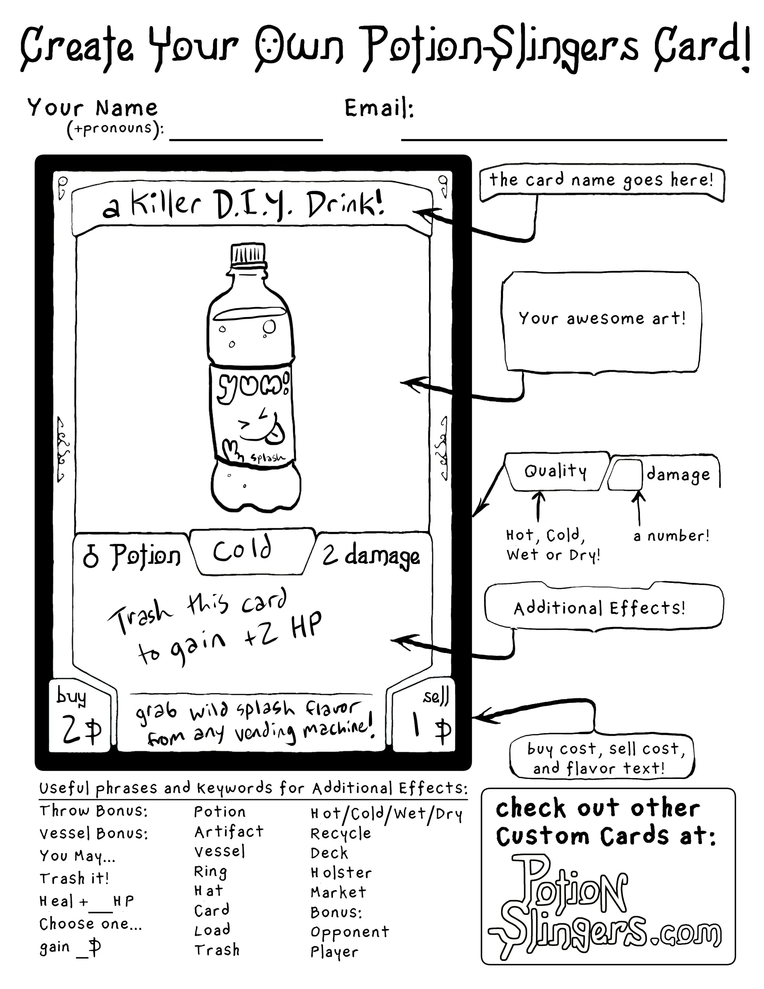 Here is a template to create your own potion card for the game! I will be compiling all of the entries into one glorious printable pdf, to play alongside the real game!
